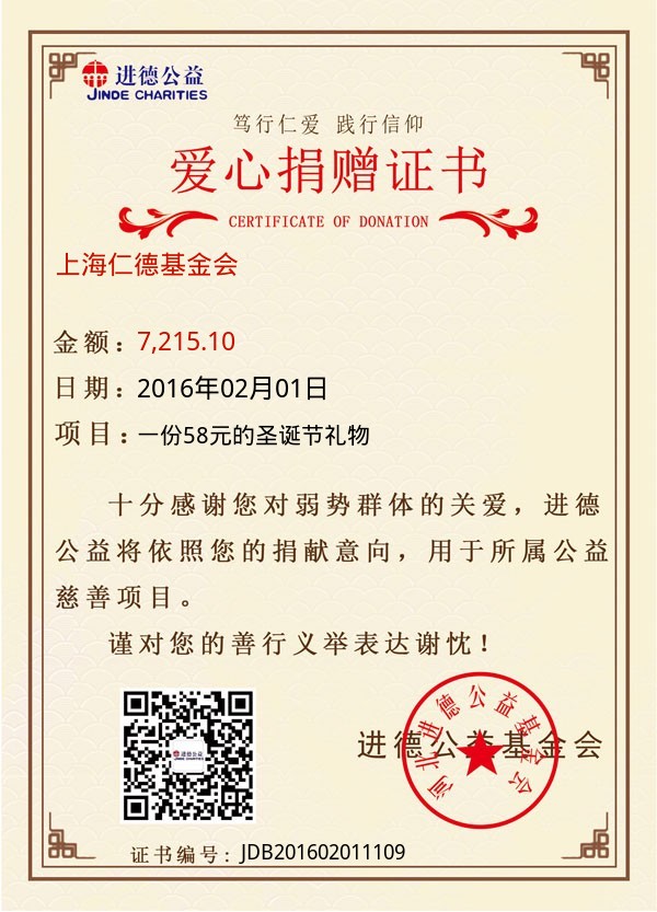 | 上海仁德基金会 | 7,215.10 | 一份58元的圣诞节礼物 | 捐款证书 | 2016-02-01 |