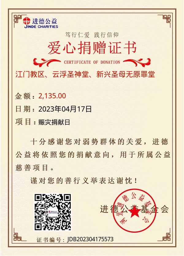 | 江门教区、云浮圣神堂、新兴圣母无原罪堂 | 2,135.00 | 赈灾捐献日 | 捐款证书 | 2023-04-17 |