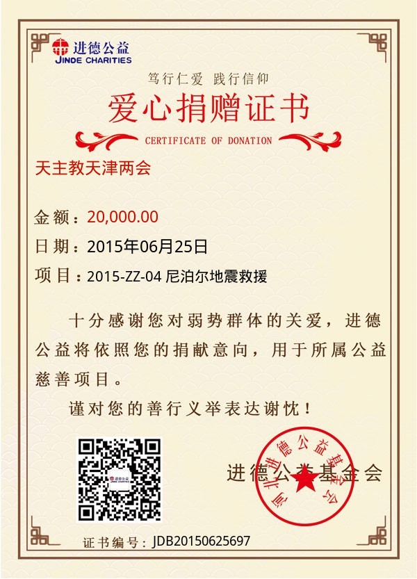 | 天主教天津两会 | 20,000.00 | 2015-ZZ-04 尼泊尔地震救援 | 捐款证书 | 2015-06-25 |