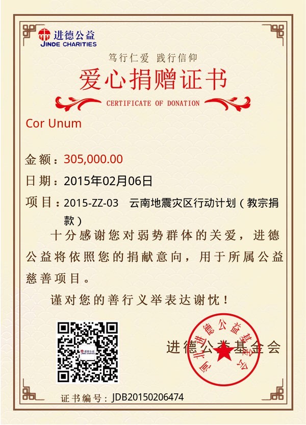 | Cor Unum | 305,000.00 | 2015-ZZ-03 云南地震灾区行动计划(教宗捐款) | 捐款证书 | 2015-02-06 |