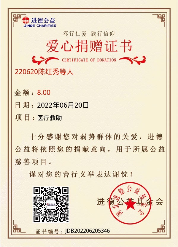 | 220620陈红秀等人 | 8.00 | 医疗救助 | 捐款证书 | 2022-06-20 |