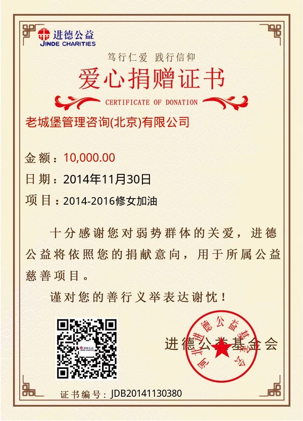 | 老城堡管理咨询(北京)有限公司 | 10,000.00 | 2014-2016修女加油 | 捐款证书 | 2014-11-30 |