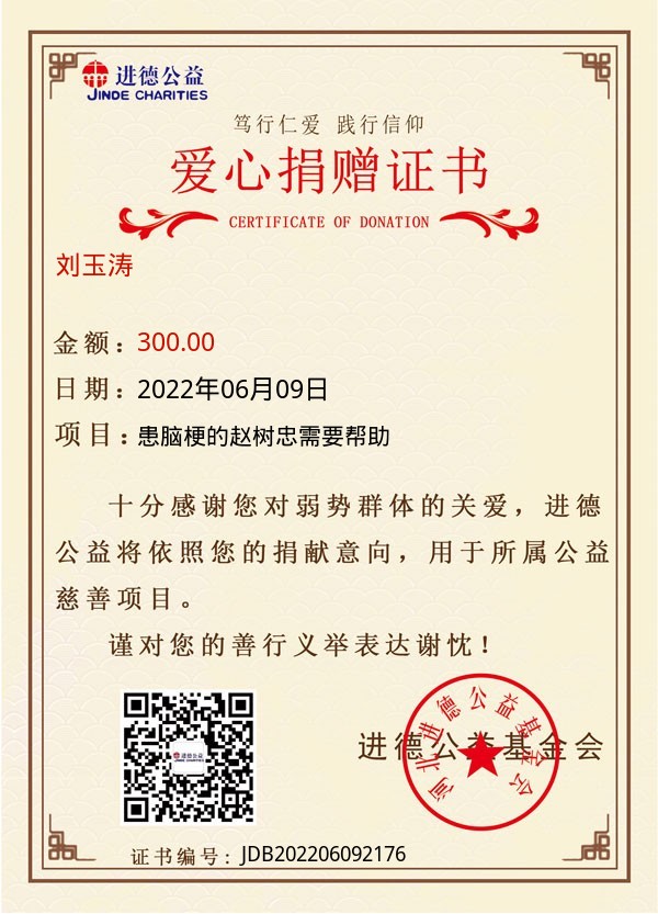 | 刘玉涛 | 300.00 | 患脑梗的赵树忠需要帮助 | 捐款证书 | 2022-06-09 |