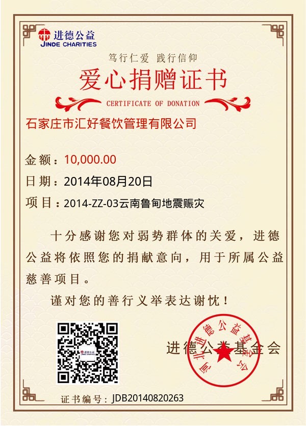 | 石家庄市汇好餐饮管理有限公司 | 10,000.00 | 2014-ZZ-03云南鲁甸地震赈灾 | 捐款证书 | 2014-08-20 |