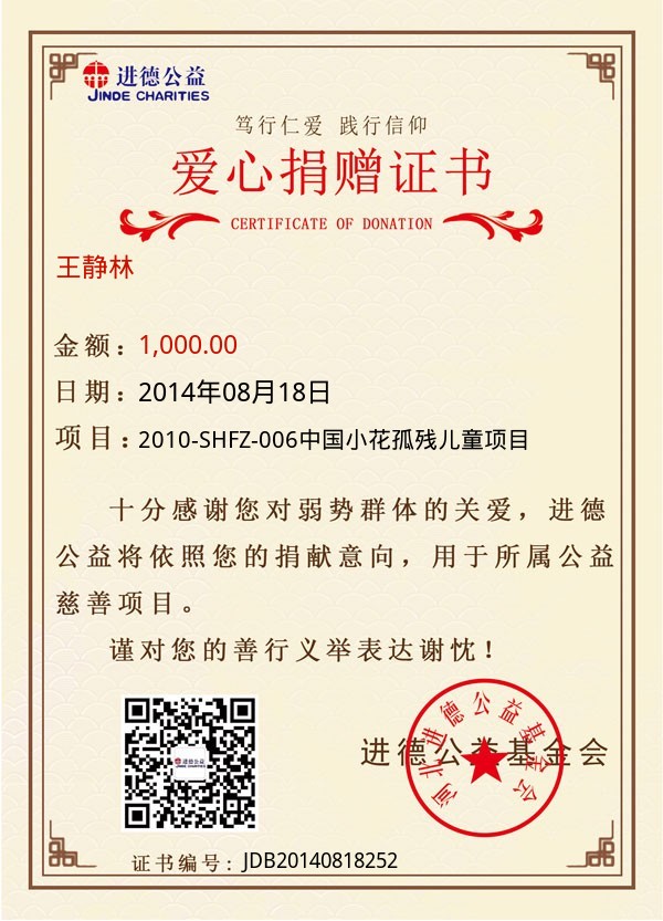 | 王静林 | 1,000.00 | 2010-SHFZ-006中国小花孤残儿童项目 | 捐款证书 | 2014-08-18 |