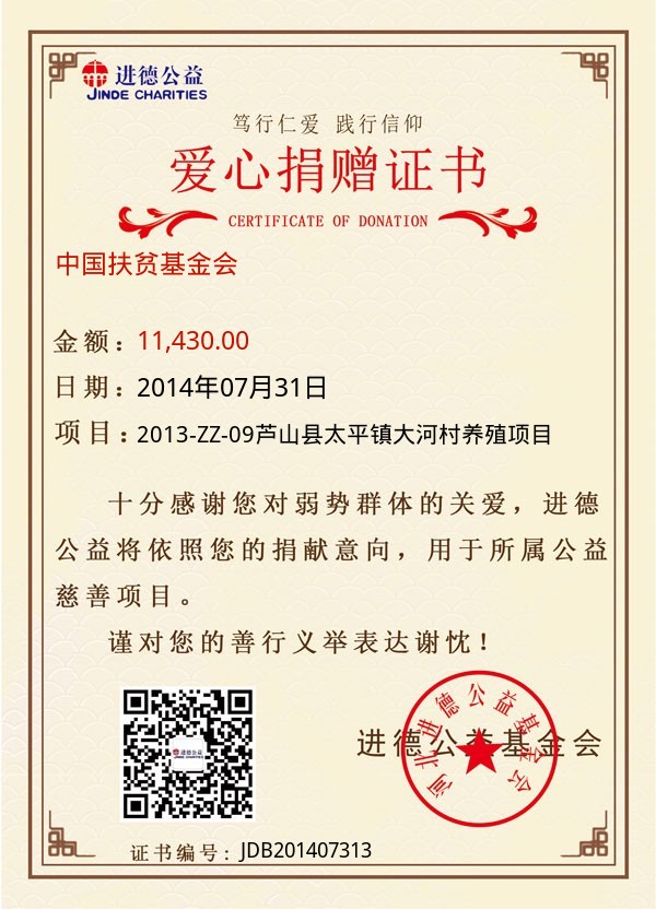 | 中国扶贫基金会 | 11,430.00 | 2013-ZZ-09芦山县太平镇大河村养殖项目 | 捐款证书 | 2014-07-31 |