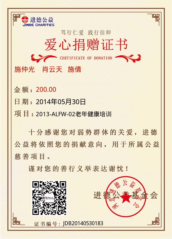 | 施仲光 肖云天 施倩 | 200.00 | 2013-ALFW-02老年健康培训 | 捐款证书 | 2014-05-30 |