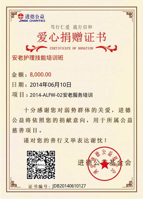 | 安老护理技能培训班 | 8,000.00 | 2014-ALFW-02安老服务培训 | 捐款证书 | 2014-06-10 |