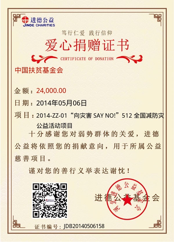| 中国扶贫基金会 | 24,000.00 | 2014-ZZ-01“向灾害 SAY NO!”512 全国减防灾公益活动项目 | 捐款证书 | 2014-05-06 |