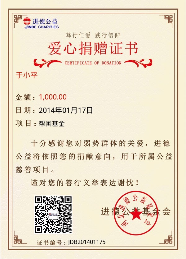 | 于小平 | 1,000.00 | 帮困基金 | 捐款证书 | 2014-01-17 |