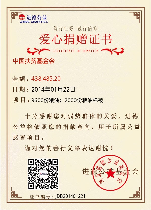 | 中国扶贫基金会 | 429,200.00 | 9600份粮油;2000份粮油棉被 | 捐款证书 | 2014-01-22 |