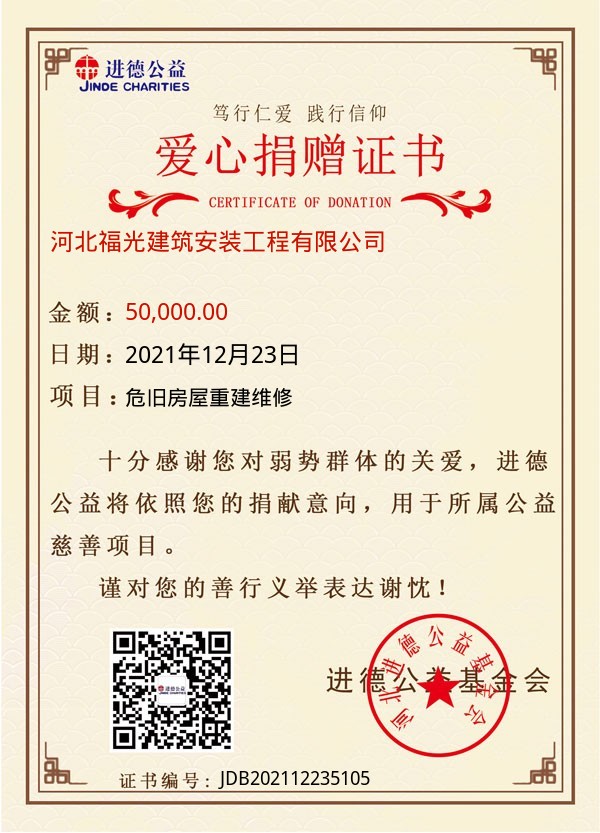 | 河北福光建筑安装工程有限公司 | 50,000.00 | 危旧房屋重建维修 | 捐款证书 | 2021-12-23 |