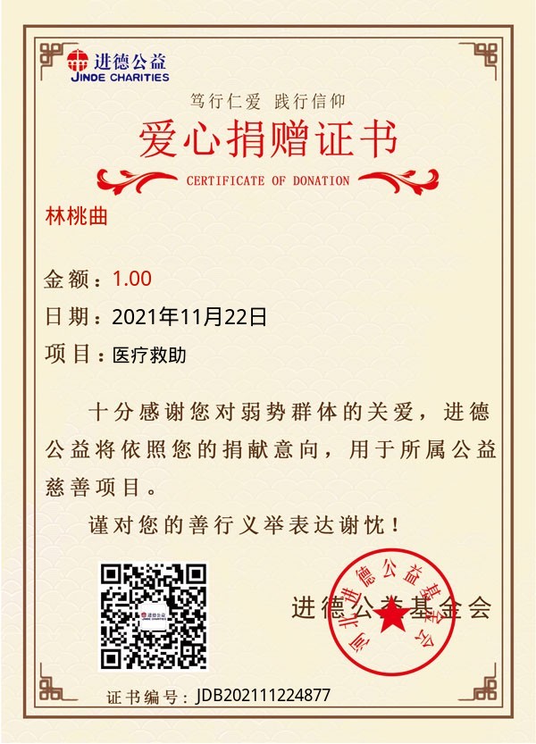 | 林桃曲 | 1.00 | 医疗救助 | 捐款证书 | 2021-11-22 |