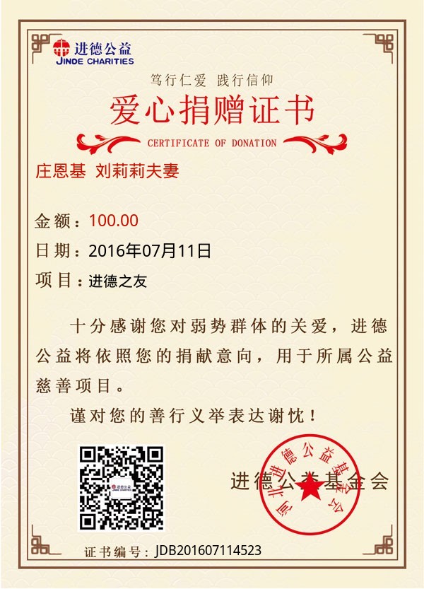 | 庄恩基 刘莉莉夫妻 | 100.00 | 进德之友 | 捐款证书 | 2016-07-11 |