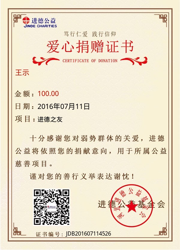 | 王示 | 100.00 | 进德之友 | 捐款证书 | 2016-07-11 |