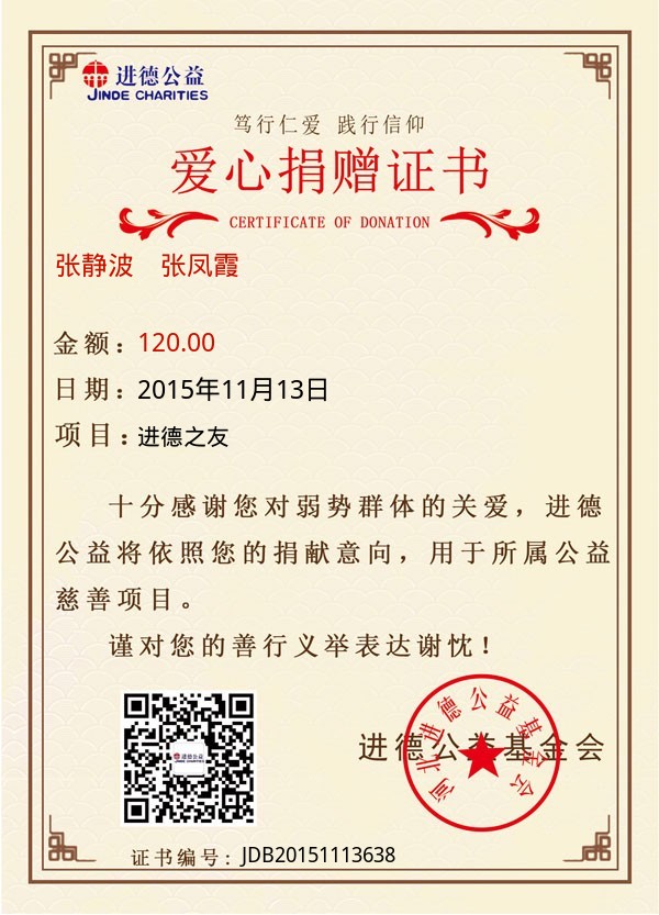 | 张静波 张凤霞 | 120.00 | 进德之友 | 捐款证书 | 2015-11-13 |