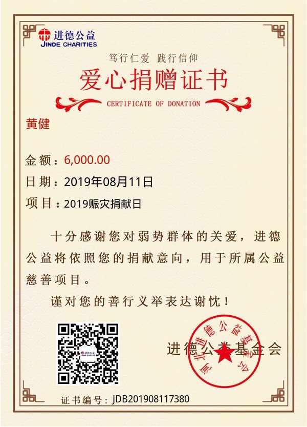 | 黄健 | 6,000.00 | 2019赈灾捐献日 | 捐款证书 | 2019-08-11 |