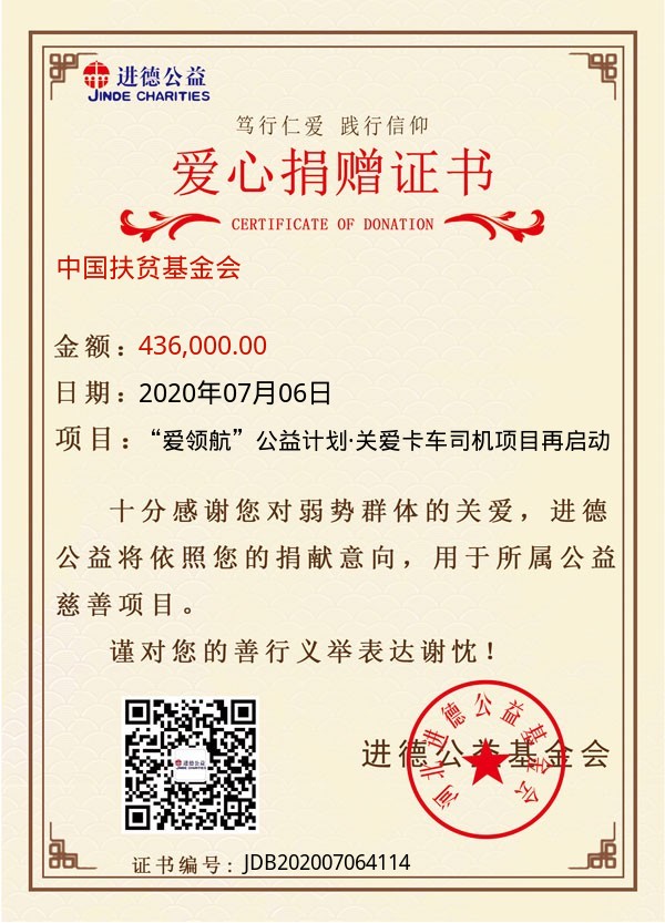 | 中国扶贫基金会 | 436,000.00 | “爱领航”公益计划·关爱卡车司机项目再启动 | 捐款证书 | 2020-07-06 |