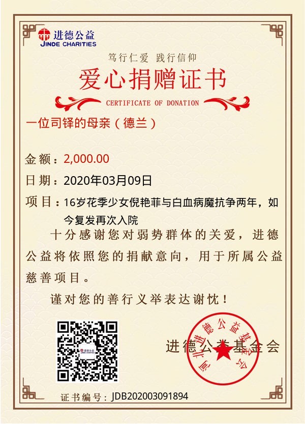 | 一位司铎的母亲(德兰) | 2,000.00 | 16岁花季少女倪艳菲与白血病魔抗争两年,如今复发再次入院 | 捐款证书 | 2020-03-09 |