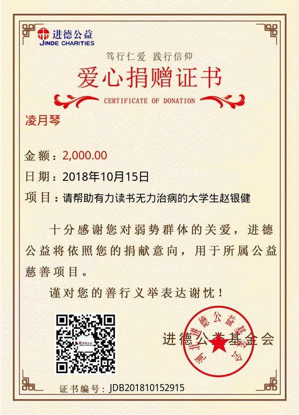 | 凌月琴 | 2,000.00 | 请帮助有力读书无力治病的大学生赵银健 | 捐款证书 | 2018-10-15 |
