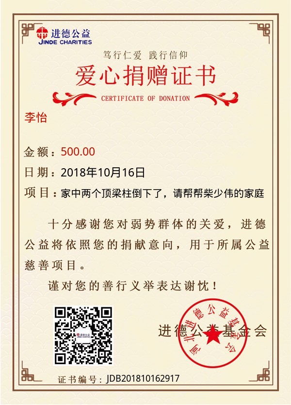| 李怡 | 500.00 | 家中两个顶梁柱倒下了,请帮帮柴少伟的家庭 | 捐款证书 | 2018-10-16 |