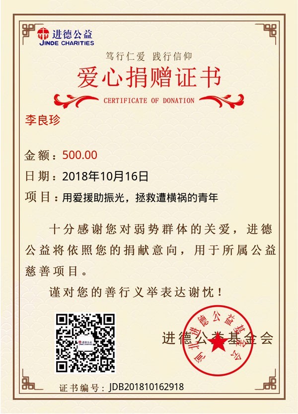 | 李良珍 | 500.00 | 用爱援助振光,拯救遭横祸的青年 | 捐款证书 | 2018-10-16 |