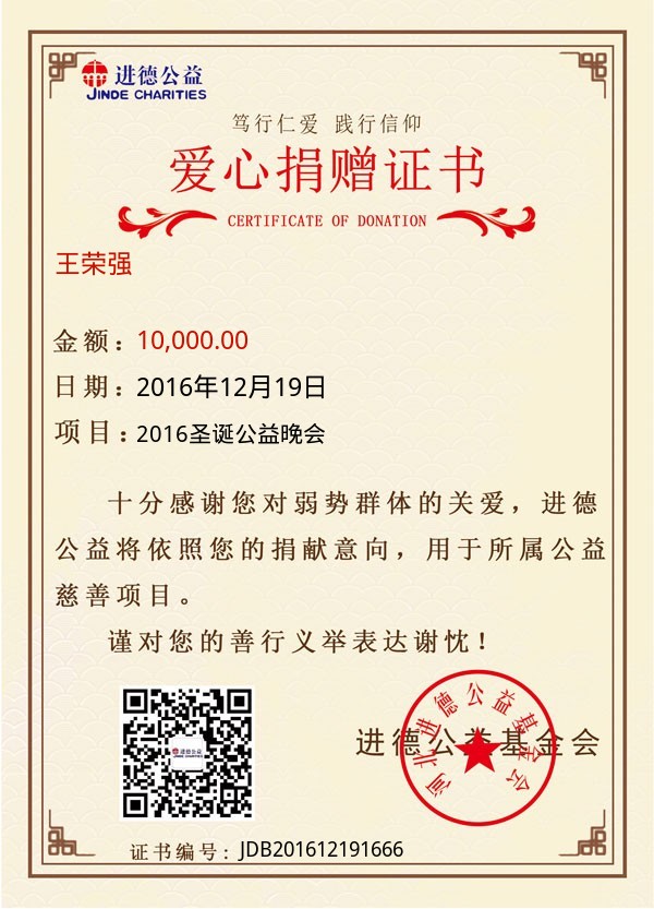 | 王荣强 | 10,000.00 | 2016圣诞公益晚会 | 捐款证书 | 2016-12-19 |