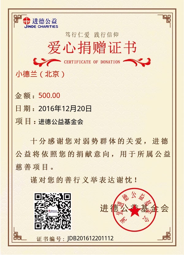 | 小德兰(北京) | 500.00 | 进德公益基金会 | 捐款证书 | 2016-12-20 |