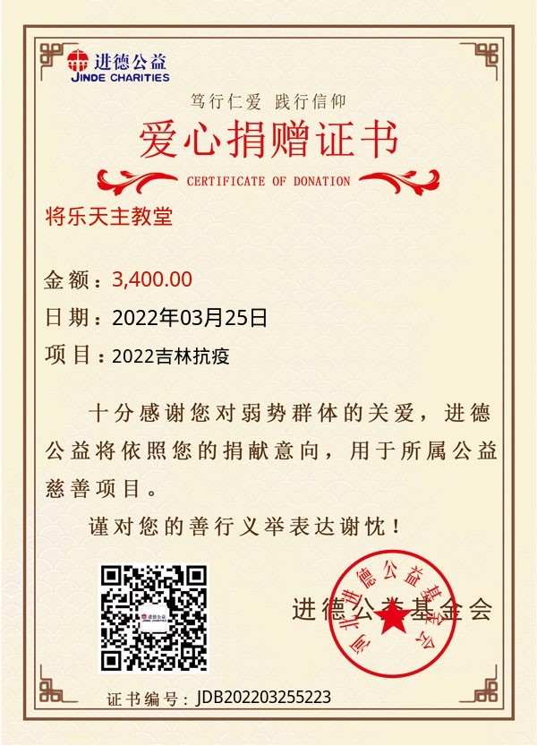 | 将乐天主教堂 | 3,400.00 | 2022吉林抗疫 | 捐款证书 | 2022-03-25 |