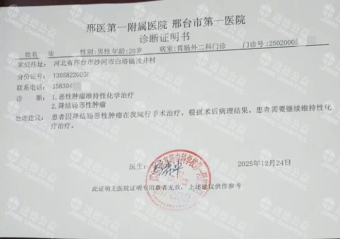 我是*灿的妈妈。我的孩子*灿,在2025年2月10日被确诊为结肠癌晚期恶性肿瘤。医生评估后,给出了长期化疗、放疗与靶向治疗的方案。2月15日,*灿顺利完成肿瘤切除手术,可仅化疗两个月,他的精神疾病就突然发作,这一住又是两个月。