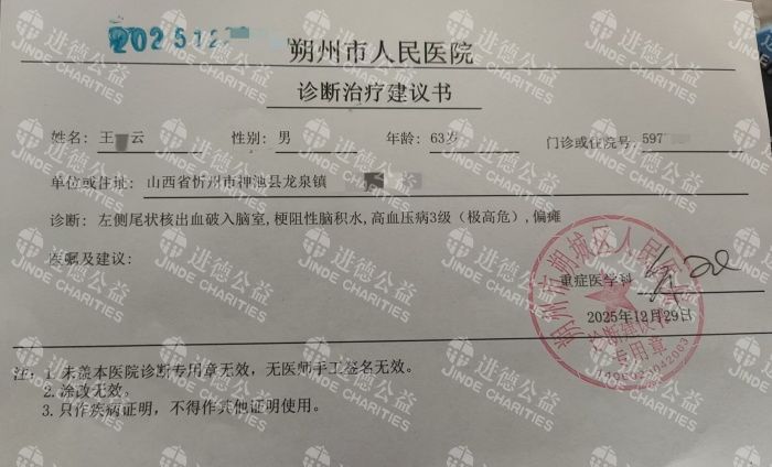 我们不敢有丝毫耽搁,紧急将父亲转往朔州市朔城区人民医院。抵达医院后,医生立刻展开抢救并完善检查,很快就拿出了诊断报告——脑出血!因为病情凶险,医院当即安排了手术。经过数小时的紧张救治,手术顺利完成,但父亲术后直接被转入重症监护室,至今仍未脱离危险。