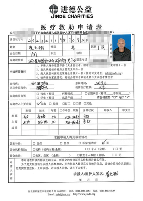 崔志彬,男,29岁,黑龙江省海伦市联发乡百丰村人。于2015年10月9日在北京佑安医院检查诊断为非霍奇金弥漫大B淋巴瘤四期。由于治疗费用巨大,目前已花掉家里所有积蓄,后期昂贵的治疗费用家里再也无力承担!在此无助的情况下,特向进德公益申请援助,恳请贵会及众教友伸出援助之手给予大力帮助!