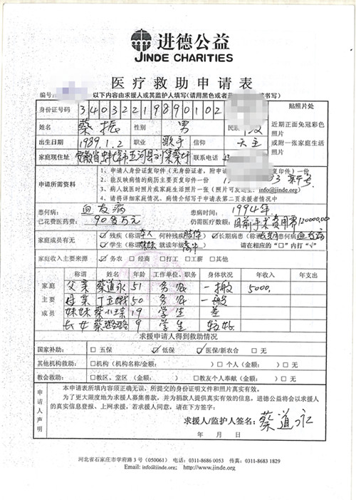 蔡振,男,28岁,安徽五河县蔡玗村教友。从我五岁开始患血友病至今,花了一百多万医药费了,家里欠了很多外债。因为我的病,向很多亲戚朋友们借过钱,亲戚朋友都不敢和我们继续相处下去。我的母亲身体不好,在家坚持干活给我、我读书的妹妹和我的两个9岁、7岁的孩子,家里有时候连吃的油炒菜都没有。家里粮食、生活费和家里妹妹、我的两个孩子读书的费用都是好心人帮助的。父亲患高血压一直承担家庭所有的重担,外出打工。我的妻子不堪忍受,带着我们三个孩子中的最小的一个孩子离家出走。家里还有两个大一些的孩子每天上学,两个孩子是学校里最差的条件。孩子看见同学们有好吃的、好玩的、好穿的就哭,但孩子知道家里没钱困难就不要那些,我感到非常内疚、惭愧!我自己身体发病多次,都是一个人忍受着残忍的痛苦,有钱用药就会好起来,还可以做一些轻松的工作为家里减轻些经济负担。我从小喜欢唱歌,参加过国内很多选秀歌唱的比赛,获得过多次周冠军、月冠军及各种优秀奖励,多次进入复赛及总决赛,但因身体发病耽误错过了比赛,至今很可惜深感遗憾。我的家庭非常困难,自己在病床上躺着不能下床,因没钱用药腿伤也无法恢复,下床行走做事,家庭现在太困难了。请大家帮帮我!