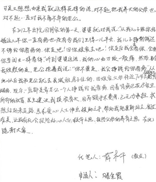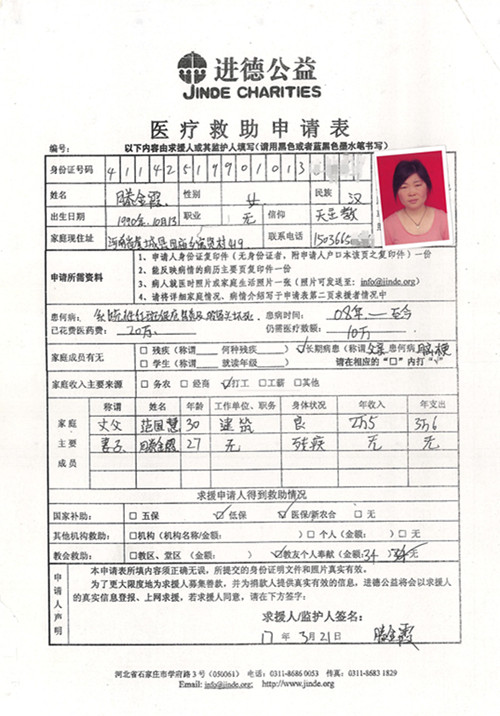 滕金霞,女,27岁,河南省虞城县田庙乡寓贤村人,我于2008年10月因感冒引起脸、眼、腿脚浮肿,被确诊为肾病综合症,经住院治疗病情暂时稳定。就在2012年的7月,脸部症状再次出现,呼吸困难,胸闷,于2014年5月27日再次被郑州第一附属人民医院确诊为系统性红斑狼疮、肾炎3级,因无钱治疗被迫出院,靠大量的激素药维持生命。