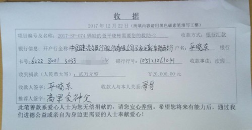 11月15日,给平晓彬治病的首笔捐款已经汇入晓彬哥哥平晓东的账户。希望给还在重症监护室的他一些力量!晓彬加油!孩子们在等你!