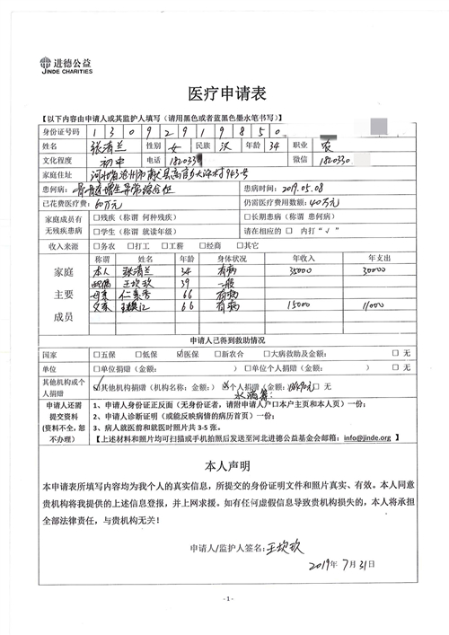 后来通过向亲友打听,6月份转到了天津中国医学院血液病医院治疗,目前已经花费了20多万元,回想起从生病到现在,每天都在饱受化学药物的摧残,每一天都活的十分艰难,但病情仍然不见好转。医生建议我做骨髓移植,费用在一百万左右,光是前两个月的治疗就花光了家里的所有积蓄,并且还借了不少外债,家中还有两个患病的老人和还在上学的孩子,丈夫为了照顾我没有办法外出打工挣钱,全家一下就断了经济来源,实在无力面对这巨额的手术费。