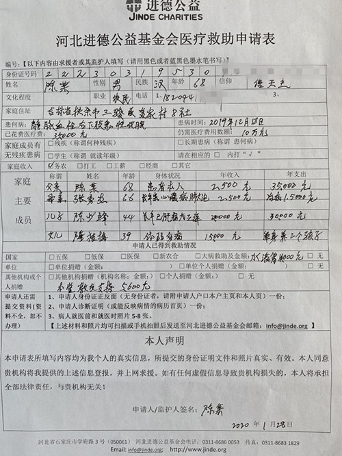 陈荣去年12月中旬发现腿上血栓,3天时间半条腿几乎溃烂。因家中实在困难没钱治病,在本村诊所医治,结果耽误最佳治疗时机,延误了病情。后来转至市里医院治疗,大约花了3万左右,借遍了亲朋好友,最后实在没钱继续治疗,只好出院回家。