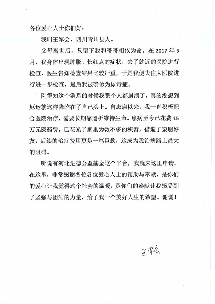 大家好,我叫王军会,父母离开后,只留下我和哥哥相依为命。在2017年5月,我身体出现肿胀、长红点的症状,去了就近的医院进行检查,医生告知检查结果比较严重,于是我便去往大医院进行进一步检查,最后我被确诊为尿毒症。
