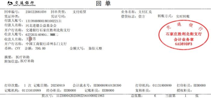 第一笔善款支付凭证(由于患者情况特殊,应社区、推荐人及服务人员共同商议,要求每月支付700元。)