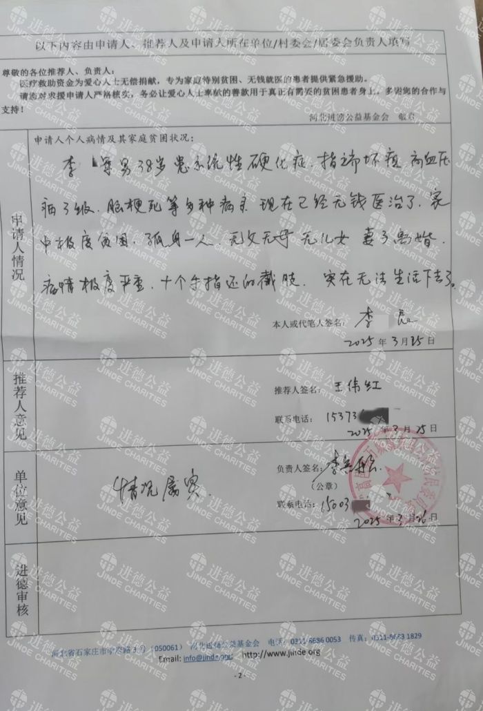 李*军一位不幸身患多种疾病的患者,正面临着极其艰难的困境。他患有系统性硬化病、高血压以及脑梗,这些疾病长期折磨着他的身体,也给他的生活带来了沉重的打击。由于病情的严重性,他失去了工作能力,家庭经济状况每况愈下,陷入了极度贫困的境地,长期以来一直无法得到有效治疗。