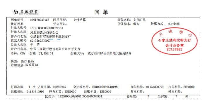 善款支付凭证(收款人为患者妻子) 支出:23,456.54元 发布时间:2025-09-15