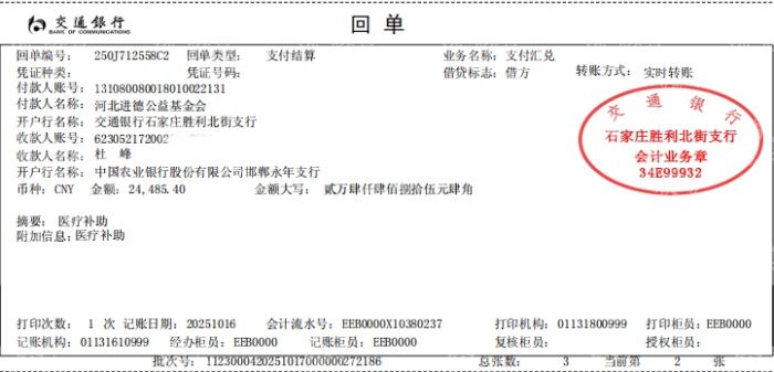 善款支付凭证(收款人为患者父亲) 支出:24,485.40元 发布时间:2025-10-22