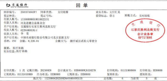 善款支付凭证(收款人为患者女儿)