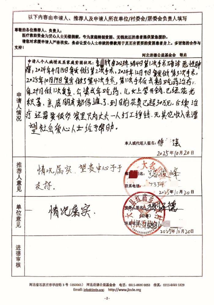 为了活下去,我咬着牙开始了漫长的治疗:2023年5月第一次手术,2024年4月15日肿瘤复发,第二次躺上手术台;2024年12月,病魔再次袭来,我又经历了第三次手术;直到2025年10月19日,复发的肿瘤让我不得不做了第四次手术。这两年多里,手术的疼痛、化疗的副作用、一次次等待检查结果的煎熬,我都能忍,可看着家里的情况一天天变差,我心里像被刀割一样疼。