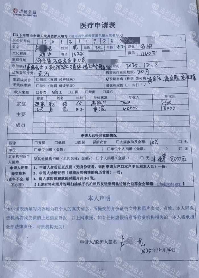 看着病房外母亲憔悴的身影,我心如刀绞。我不想放弃生的希望,不想让年迈的母亲孤零零一人。在此,我含泪求助,恳请各位好心人能伸出援手,帮帮我,帮帮这个风雨飘摇的家!您的每一份善意,都是我活下去的希望之光。他日若有机会,我定将这份恩情铭记于心,尽力回馈社会!