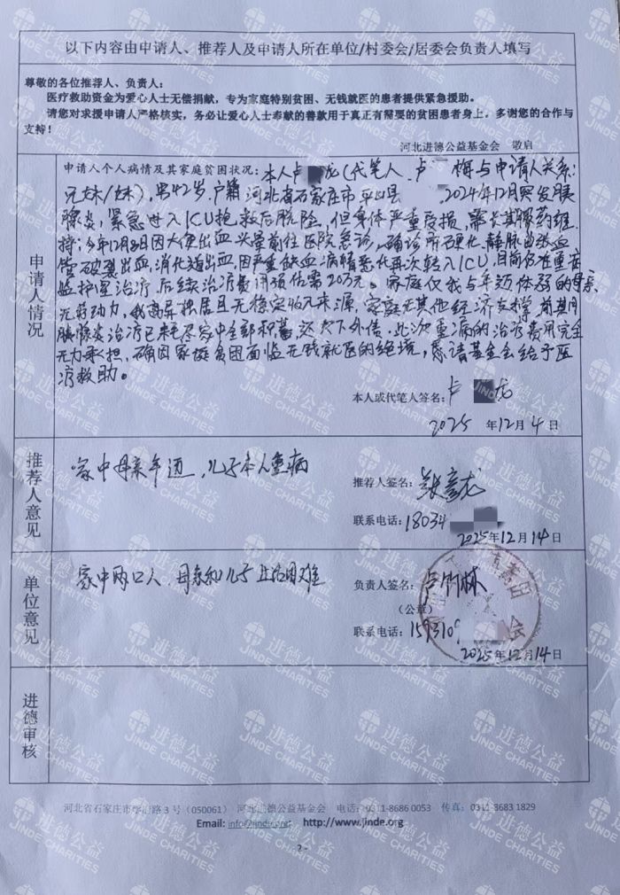 屋漏偏逢连夜雨。今年12月8日,我突然大便出血、头晕不止,被送往医院急诊后,确诊为肝硬化、静脉曲张、血管破裂出血。消化道的大出血让我严重缺血,病情急剧恶化,我再次被推入了重症监护室。躺在病床上,听着仪器的滴答声,我满心绝望——前次胰腺炎的治疗已经花光所有积蓄,还欠下了不少外债,如今后续治疗预估还需要20万元,这笔钱对我们母子而言,无疑是天文数字。