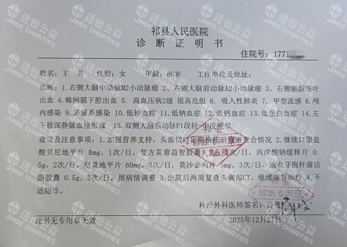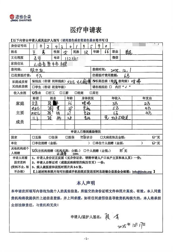 这场突如其来的重病,对于本就拮据的家庭而言,无疑是灭顶之灾。王*芳的丈夫常年患有哮喘,需要长期服药控制病情,早已耗尽了家中的积蓄。家庭经济来源十分微薄,家中的儿子工作不稳定,收入时有时无;两个女儿在外打工,薪资也仅够维持自己的基本生活,根本无力承担巨额的医疗费用。