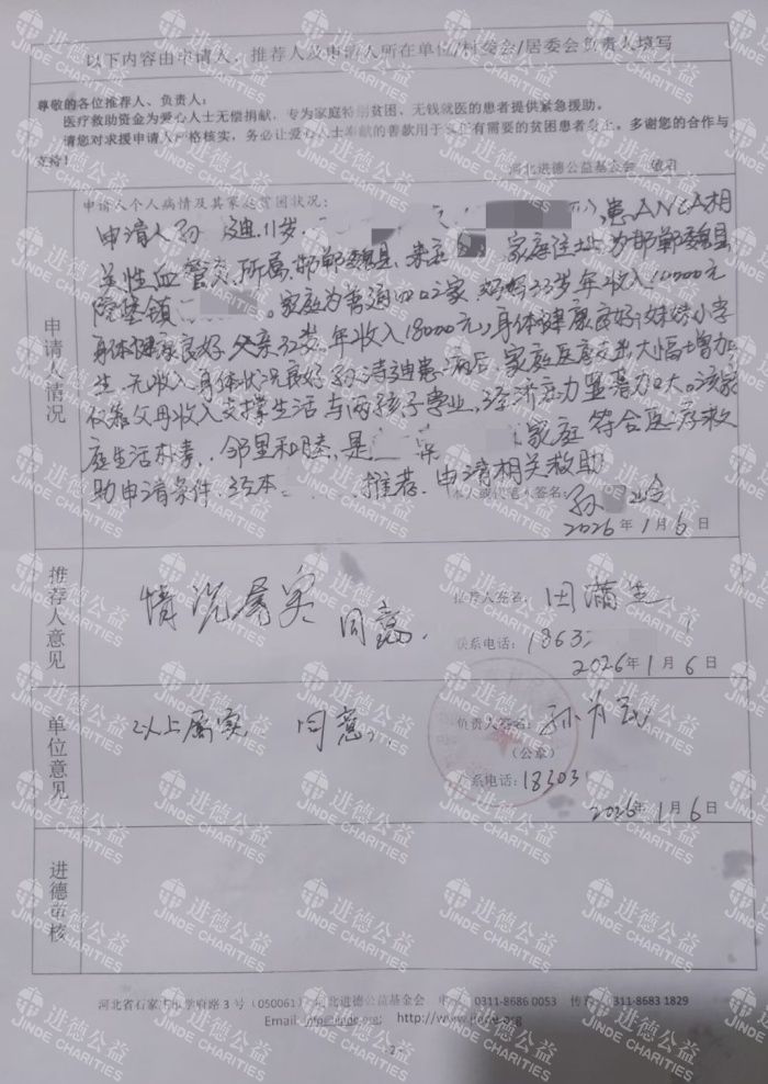 孩子患病后,家庭医疗支出大幅增加。孩子住院期间,孩子奶奶突发不适也需住院治疗,我和孩子母亲只能分头照料,母亲照顾老人,我照顾孩子,无奈关闭了家中此前经营的小店,彻底失去了收入来源。如今奶奶已出院,我和孩子母亲一同在北京照料患病的孩子,全力配合治疗。面对后续高昂的治疗费用和无收入的困境,我们万般无奈下只能向社会各界爱心人士求助,恳请大家能伸出援手,帮孩子渡过这道难关。