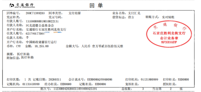 善款支付凭证,收款人为患者母亲