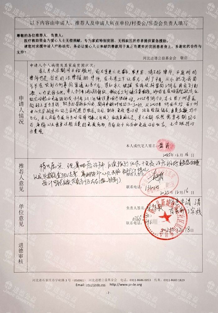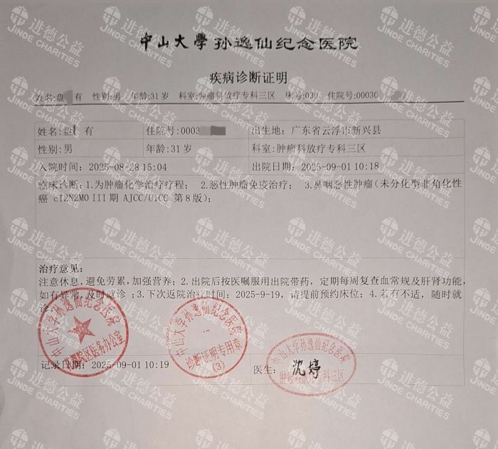 2025年2月28日,我刑满释放不久,便被确诊为鼻咽癌中晚期,并已发生颈部转移。目前,我在广州中山大学孙逸仙纪念医院接受治疗。由于治疗副作用剧烈,我无法工作,没有任何收入,现在是城乡居民最低生活保障对象。